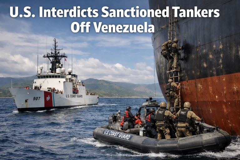 The U.S. intercepts sanctioned vessel in a controversial move off Venezuela’s coast, marking a significant escalation in Washington’s enforcement of sanctions and pressure campaign against President Nicolás Maduro’s government. U.S. officials confirmed that the Coast Guard is interdicting and seizing a tanker suspected of moving sanctioned Venezuelan oil in international waters, intensifying operations this month after another tanker — Centuries — was stopped carrying nearly 1.8 million barrels of Venezuelan crude. The action follows an unprecedented order for a “total and complete blockade” on sanctioned oil tankers, raising legal and diplomatic disputes with Caracas and global partners over maritime law and sovereignty.